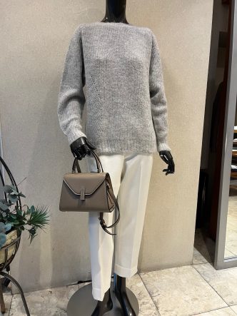 ライトグレーのニットに白の細身パンツでシンプルに、きれい目に合わせました♪