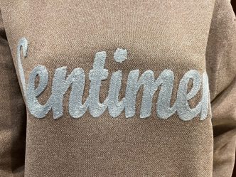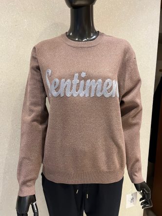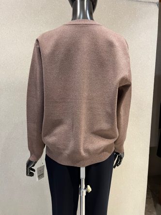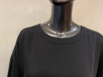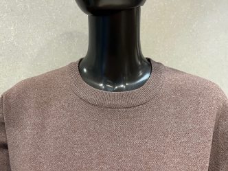 ネックは丸首。生地はふかふかとした、スポンジニット。