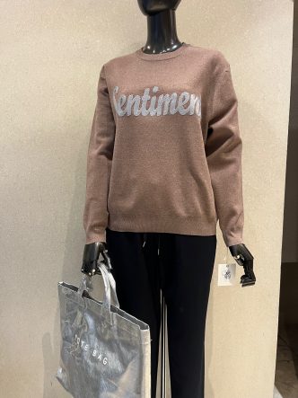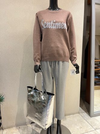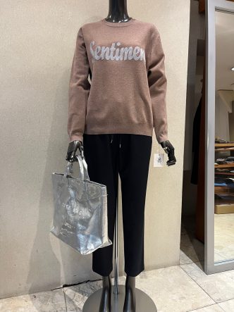 カジュアルなロゴニットにシルバーのバッグを合わせて♪