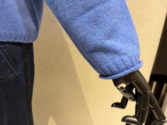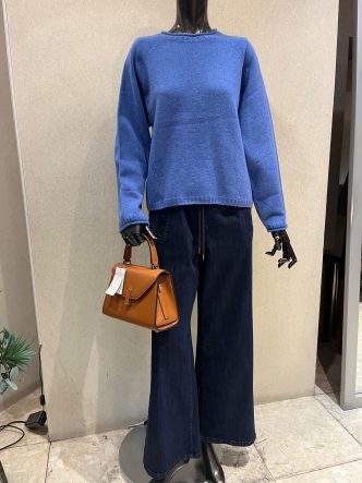 ブルーのニットにデニムを合わせて。