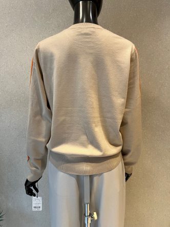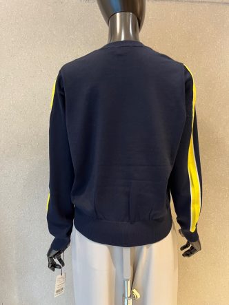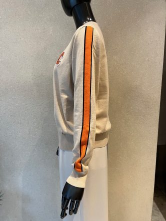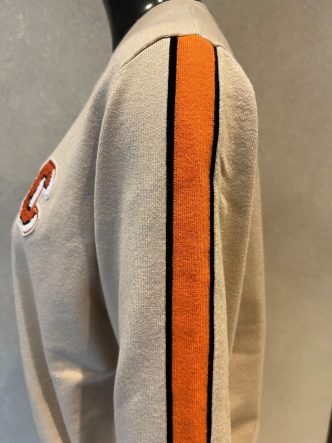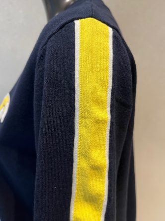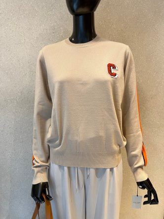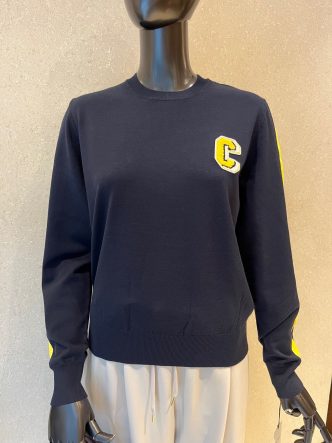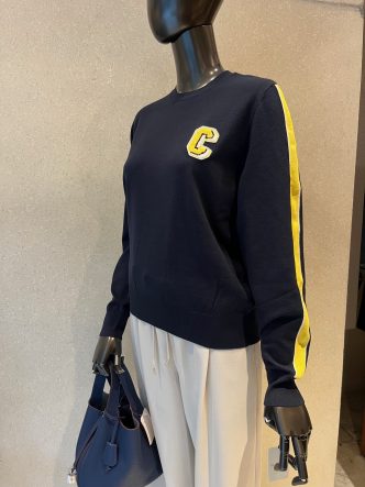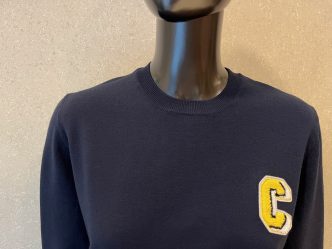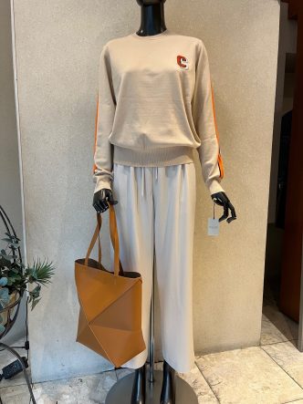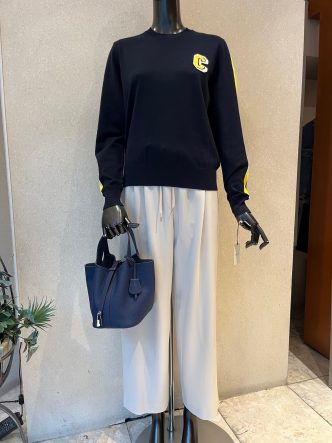 デザイン自体はシンプルな丸首のニット、この上品なデザインにロゴとラインが効いて、