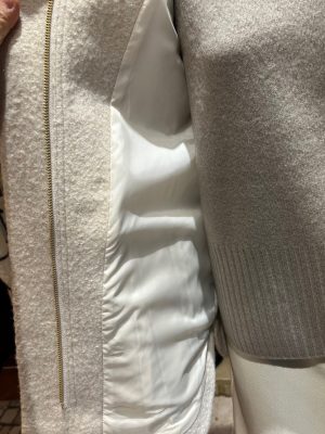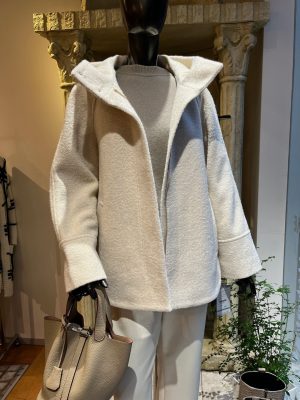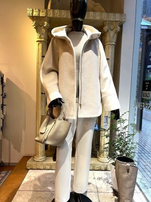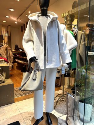 上品なエクリュカラーのコート、インにはグレージュのニット、ボトムはオフホワイトのパンツで
