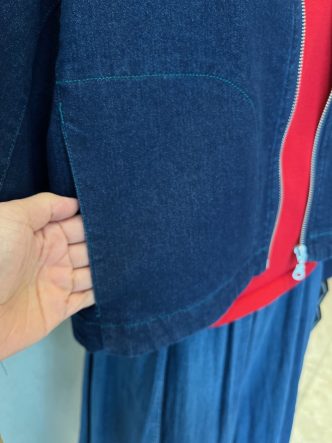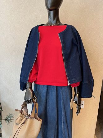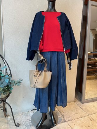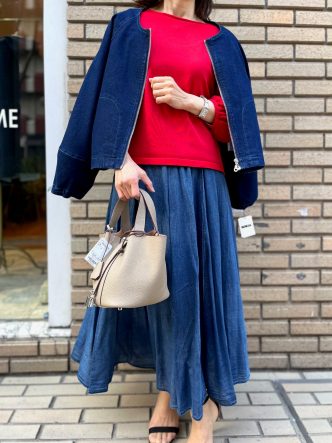 きれいな赤ニット、デニム調のスカートに、あえてデニムのジャケットで合わせてみました♡