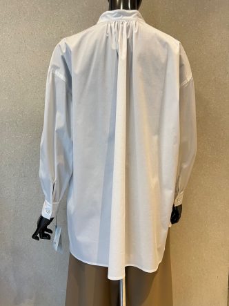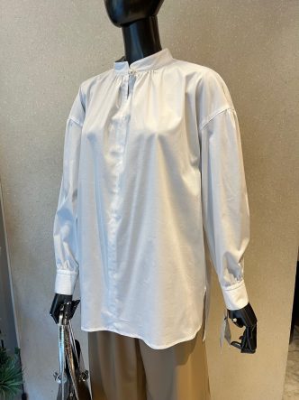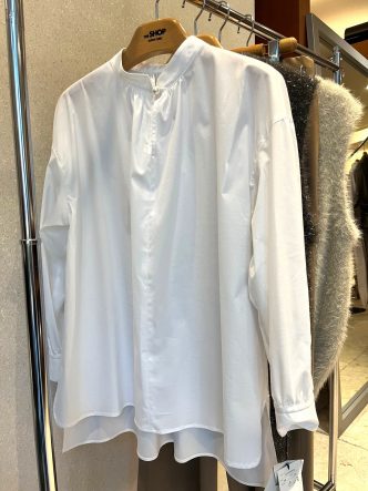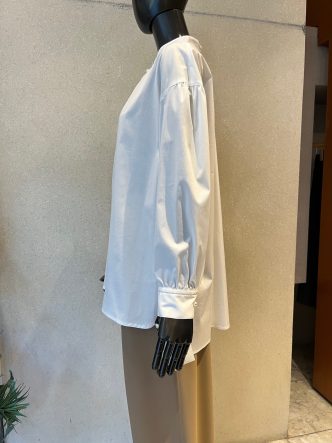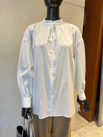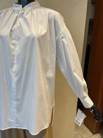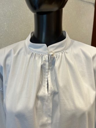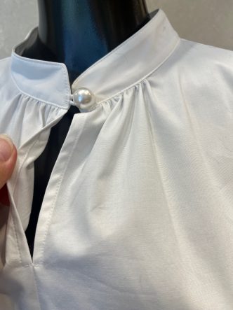 ネック下にスリットが入り、首元にはパールボタンがあしらわれています。