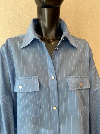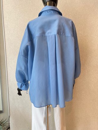 シャツ襟の、ブルーストライプがさわやかなブラウスです♡