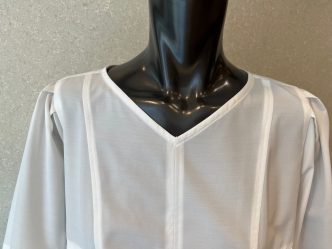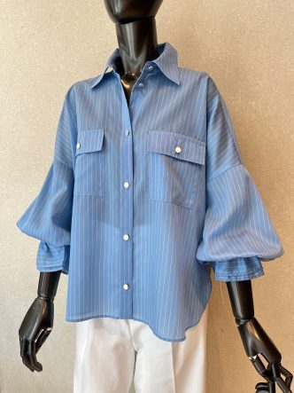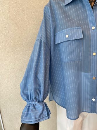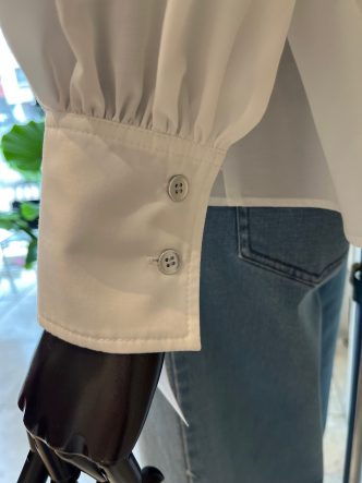 きりっとしたシャツ襟にお袖はふんわりとしたフェミニンなお袖。