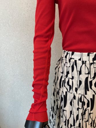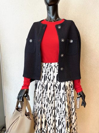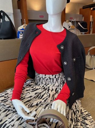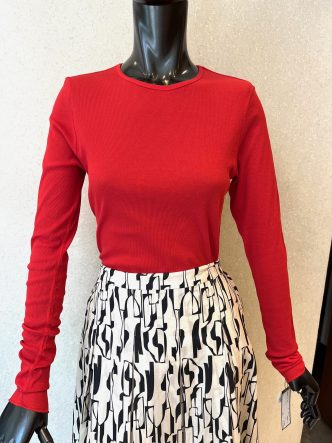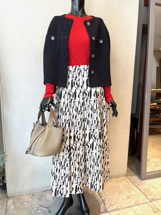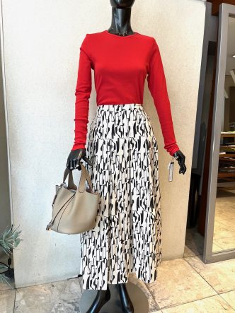 モノトーンプリントがモダンで華やか、プリントスカートに赤のカットソーを合わせて、