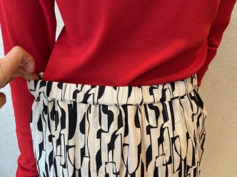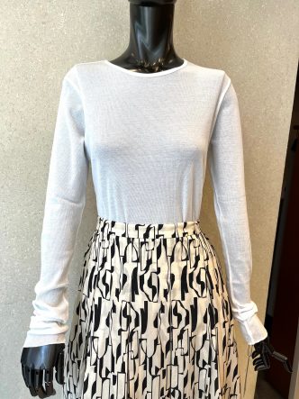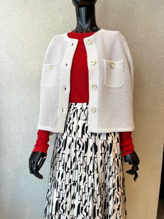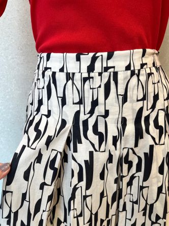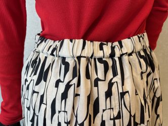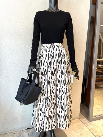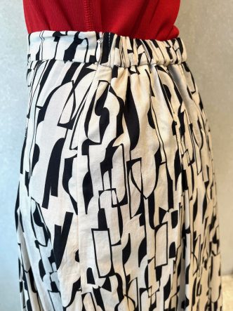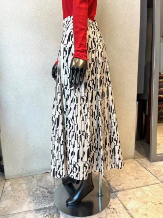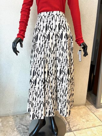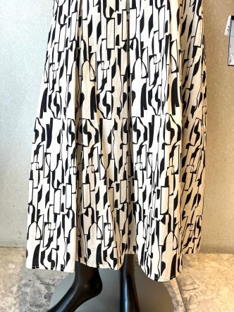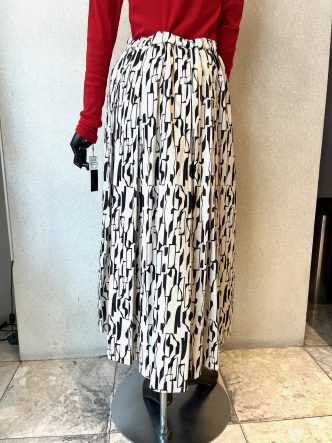 オフホワイト(オフベージュにも近いくらいの)にブラックの幾何学模様がモダンだ華やかなプリントスカートです♡