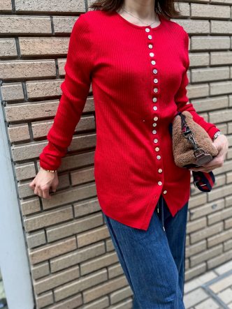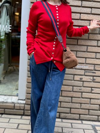赤のカーデにデニム、ムートンバッグを斜め掛けにして♪