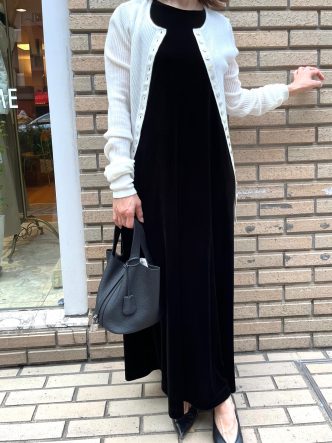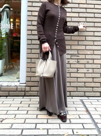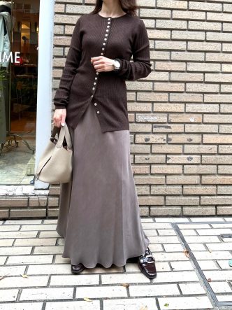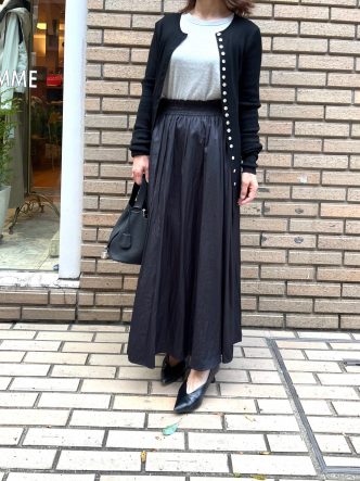 スカートのフェミニンなデザイン、細身のラインとカーディガンの長めのデザインがマッチする感じです😉