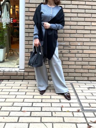 ベーシックなグレーはグレーのパンツに合わせてワントーンに。