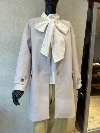 春まで着れるコーディネート♪ KOKIAボウタイブラウス&ノーカラーコート&カラーパンツ&DEARGUEロゴニット