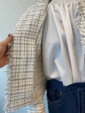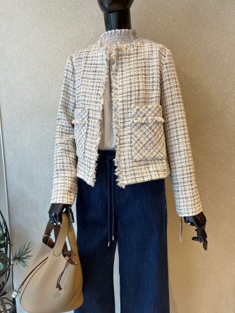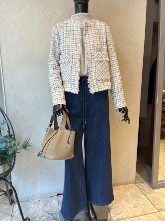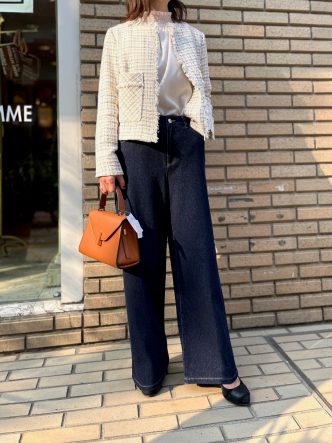 ツイードジャケットにインにはフェミニンなブラウス、デニムでカジュアルダウンしてみました。