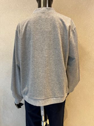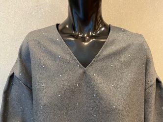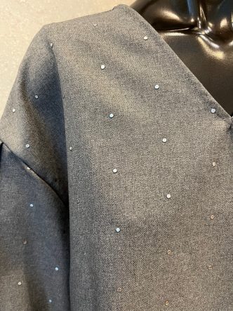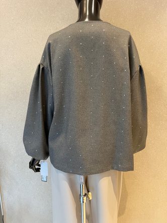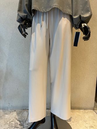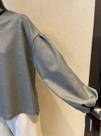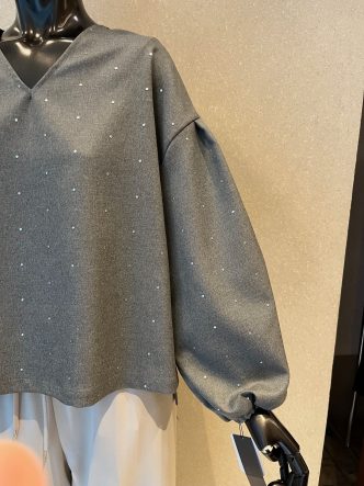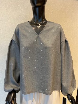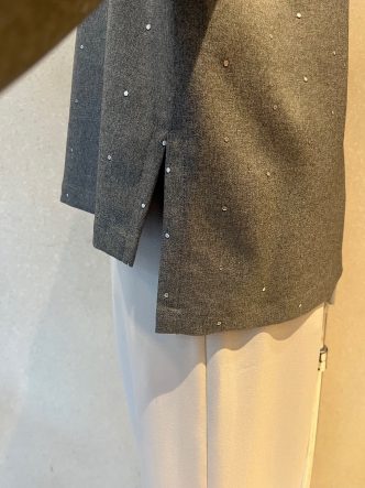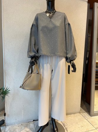 グレーの華やかさがあるブラウスに白のパンツを合わせてみました♪