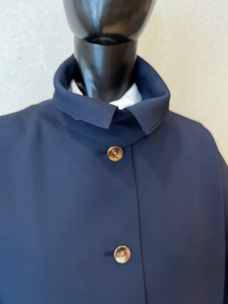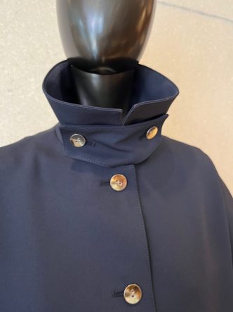 襟はステンカラーになり、襟下のベルトで襟元を留めることができます。