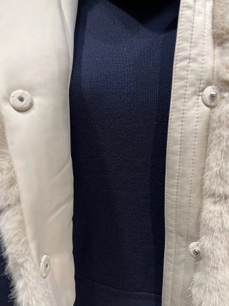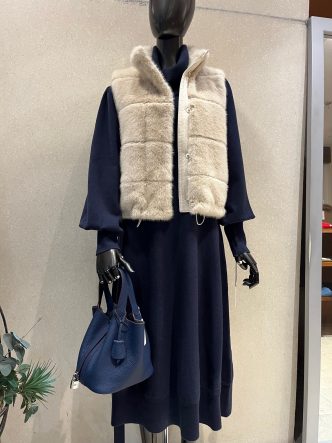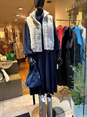 ネイビーのニットワンピースにオフベージュのエコファーベストを羽織って♡