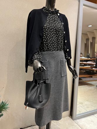 例えばジャケットなどから袖のフレアを覗かせてもいいですし、お食事の時などはキュッと上げて着て頂けるといいと思います。